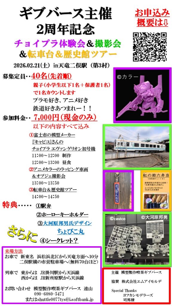 ギブバース2周年記念で、天浜線の天竜二俣駅にてプラモデル体験会を行いますので